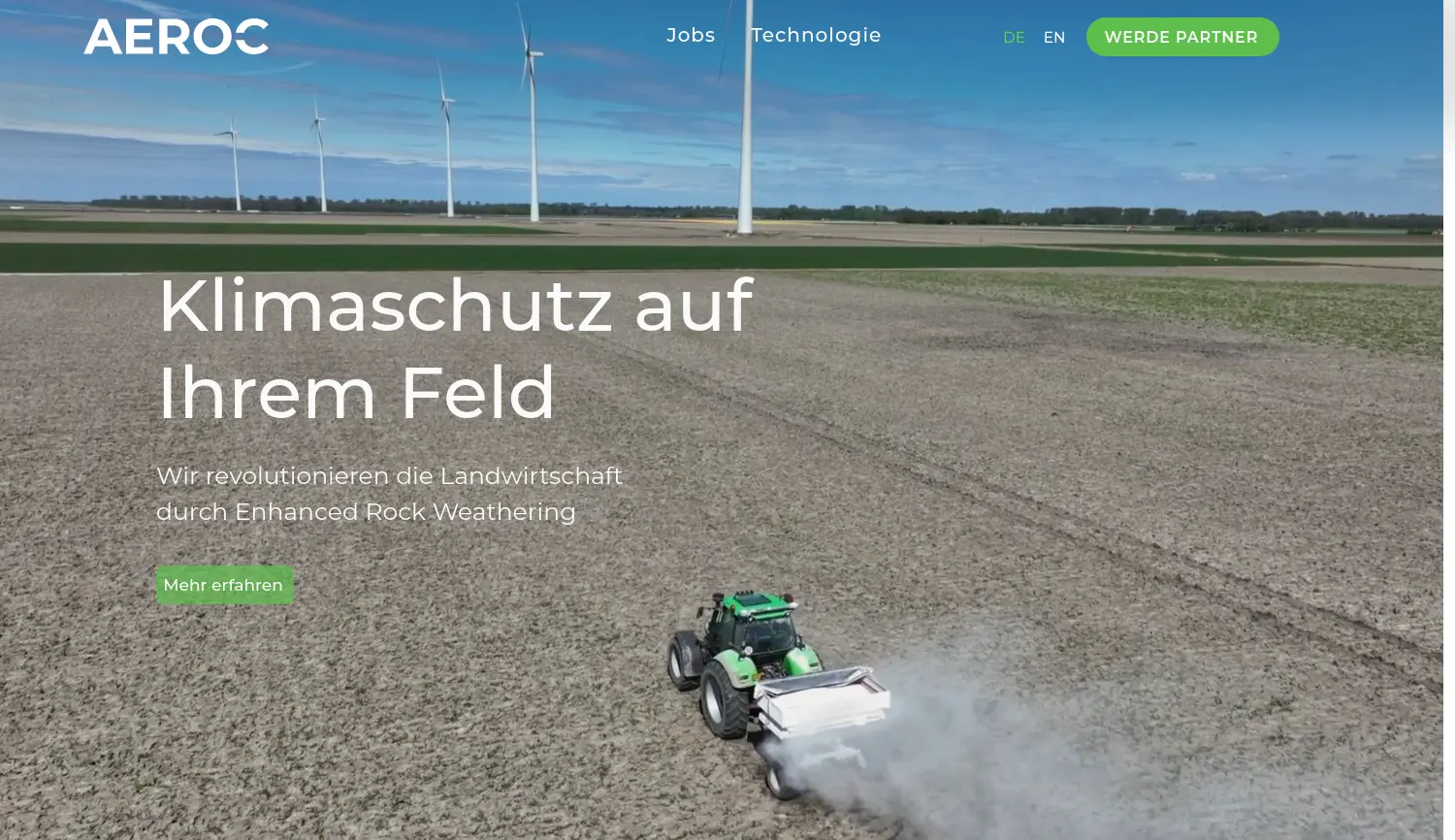 Klimaschutz auf Ihrem Feld: Dauerhafte CO₂-Speicherung durch Enhanced Rock Weathering. AEROC revolutioniert die Landwirtschaft durch Enhanced Rock Weathering (ERW), um CO₂ dauerhaft aus der Atmosphäre zu binden und Negativzertifikate zu generieren.