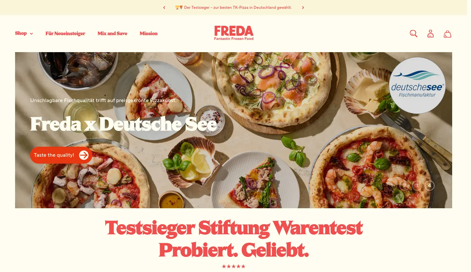 Fantastische Gerichte. Tiefgefroren zu Dir nach Hause geliefert. Freda ist ein deutsches Food-Startup, das hochwertige, handwerklich hergestellte Tiefkühlgerichte wie Pizza, Pasta und Desserts direkt über seinen Online-Shop vertreibt.