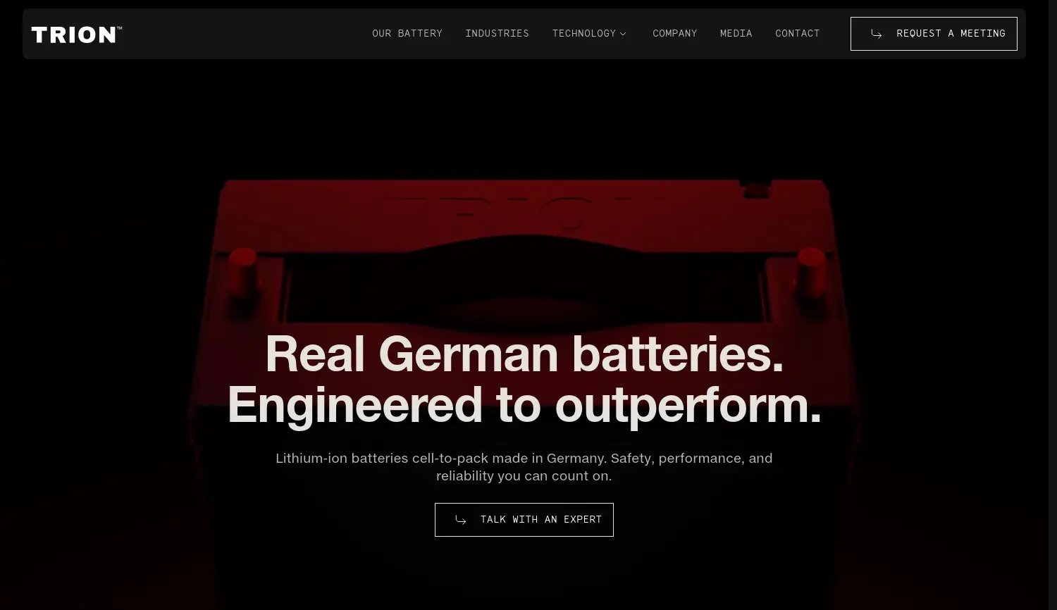 Echte deutsche Batterien. Entwickelt für überlegene Leistung. TRION entwickelt und produziert in Deutschland Hochleistungs-Lithium-Ionen-Batterien mit Cell-to-Pack-Technologie für anspruchsvolle Marine-, Logistik- und Energiespeicheranwendungen.