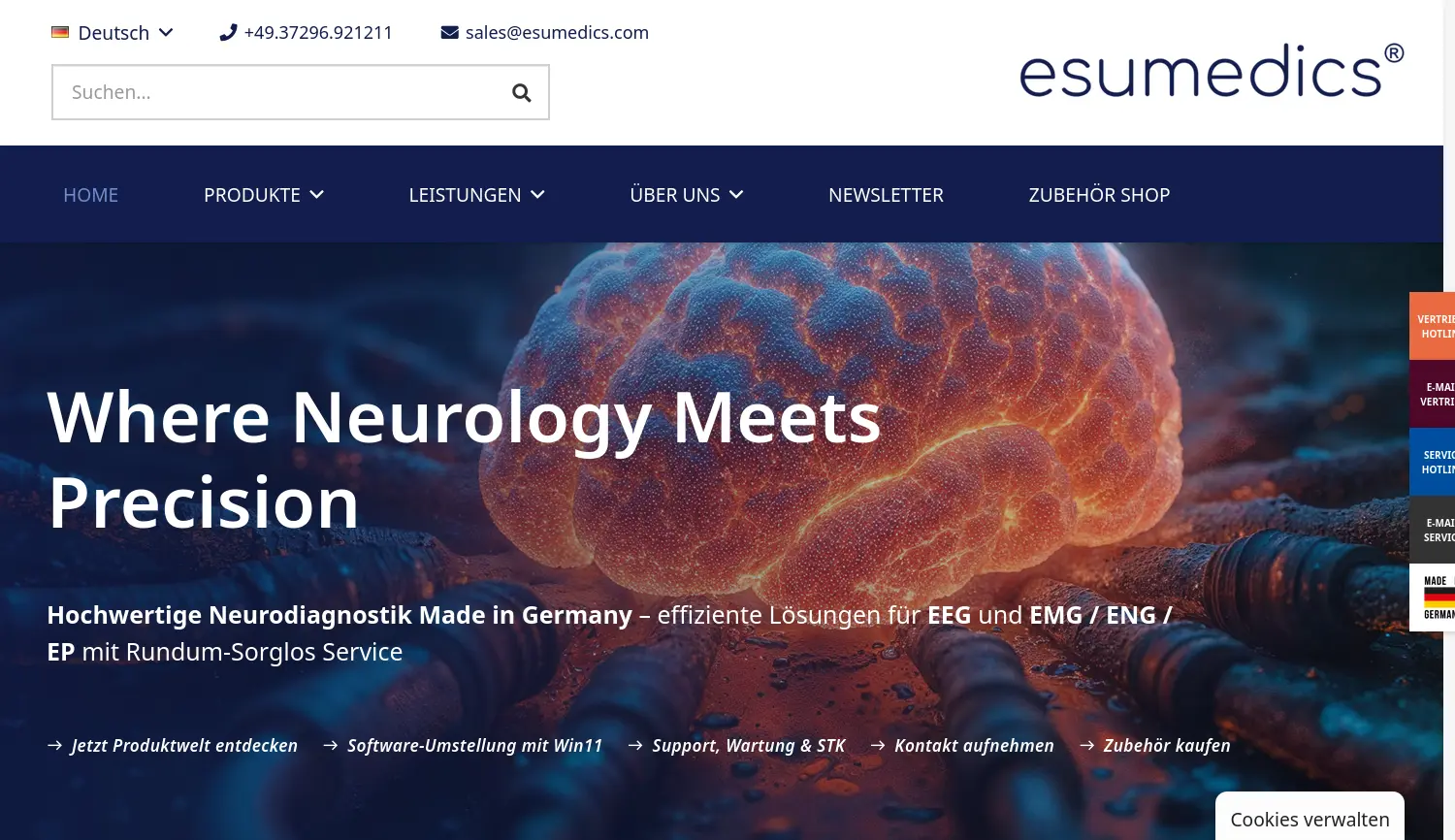 Neurodiagnostik der neuen Generation: Präzise EEG- und EMG-Systeme Made in Germany. Esumedics entwickelt und vertreibt hochwertige neurodiagnostische Systeme für EEG und EMG Made in Germany, inklusive umfassender Service- und Weiterbildungsangebote für medizinische Einrichtungen.