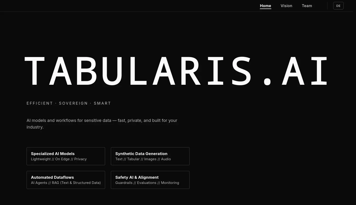 Souveräne und effiziente KI-Lösungen für sensible Daten – schnell, privat und branchenfokussiert. Tabularis.AI entwickelt effiziente, datensouveräne und branchenoptimierte KI-Modelle und Workflows für Unternehmen, die mit sensiblen Daten arbeiten.