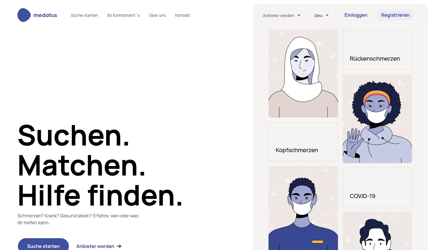 Suchen.Matchen.Hilfe finden. Medatus ist eine von Ärzten entwickelte Matching-Plattform, um schnell und anonym passende Gesundheitsleistungen und Fachleute zu finden.