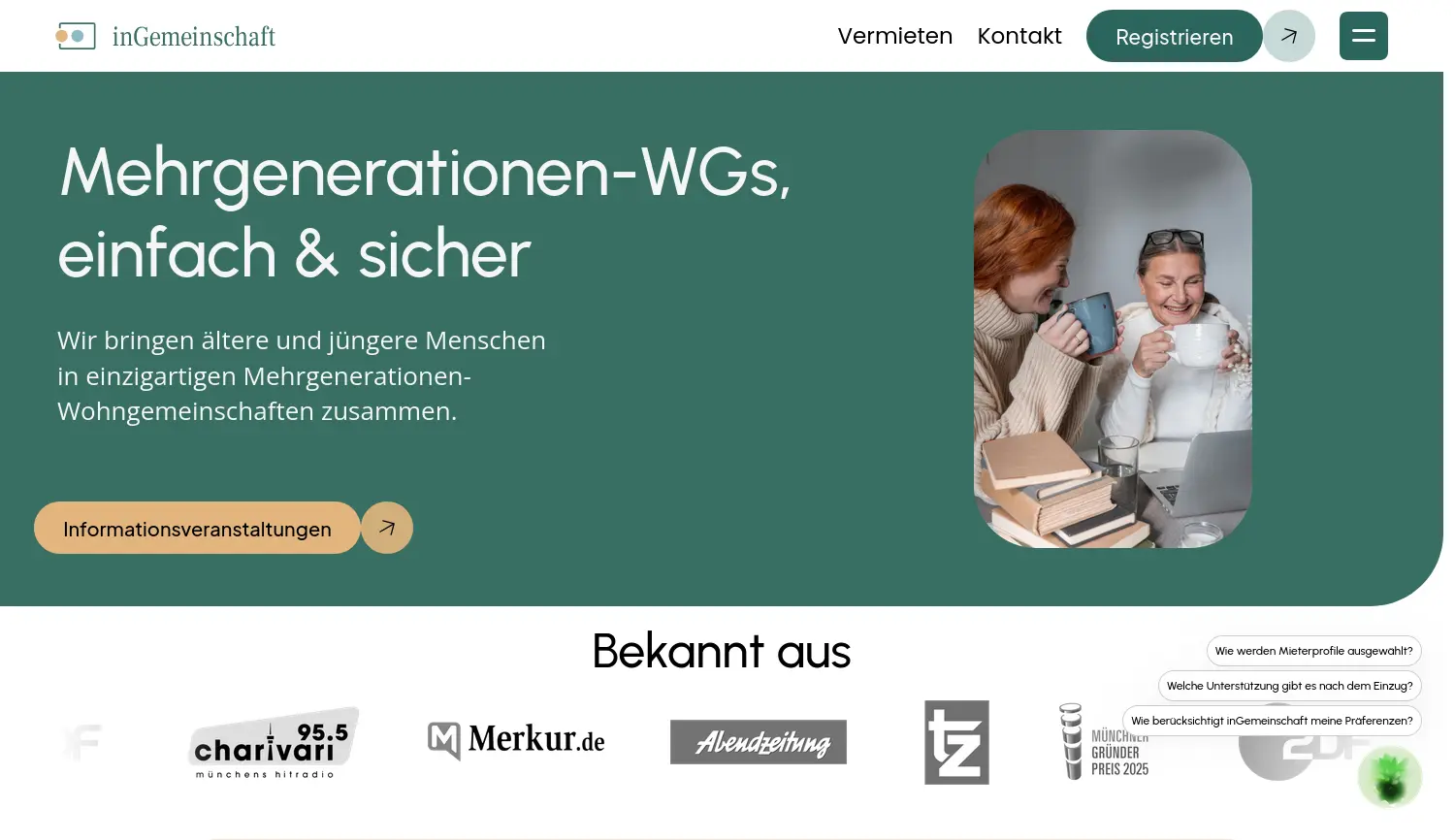 Mehrgenerationen-WGs einfach & sicher finden und gründen. inGemeinschaft vermittelt älteren und jüngeren Menschen Wohnraum in einzigartigen Mehrgenerationen-Wohngemeinschaften und bietet dabei umfassende Begleitung und Sicherheit.