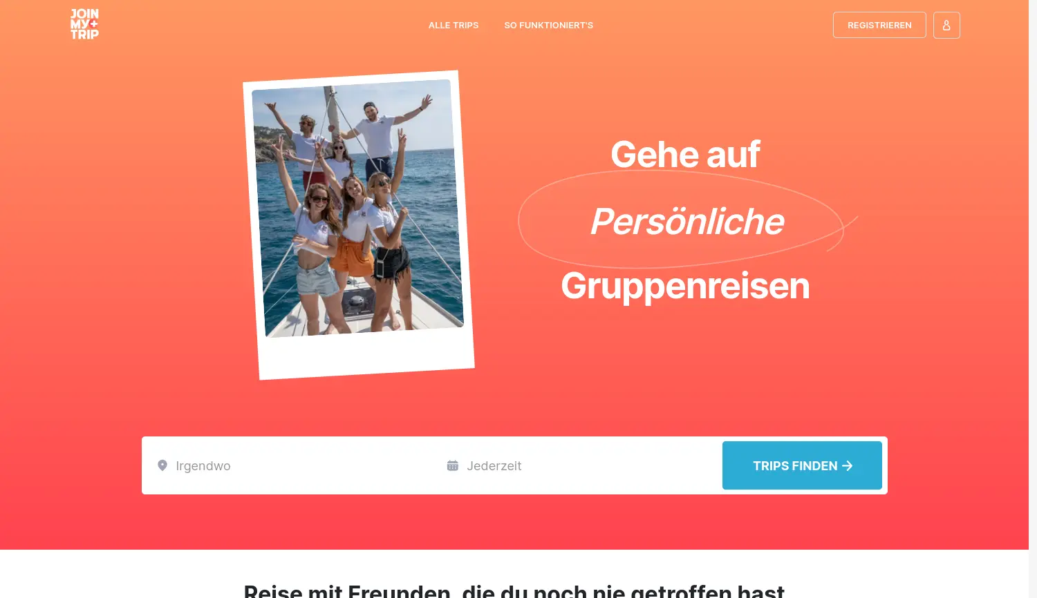 Reise mit Freunden, die du noch nie getroffen hast JoinMyTrip verbindet über 170.000 Reisende weltweit, um kleine, persönliche und freundschaftliche Gruppenreisen zu buchen und zu organisieren.