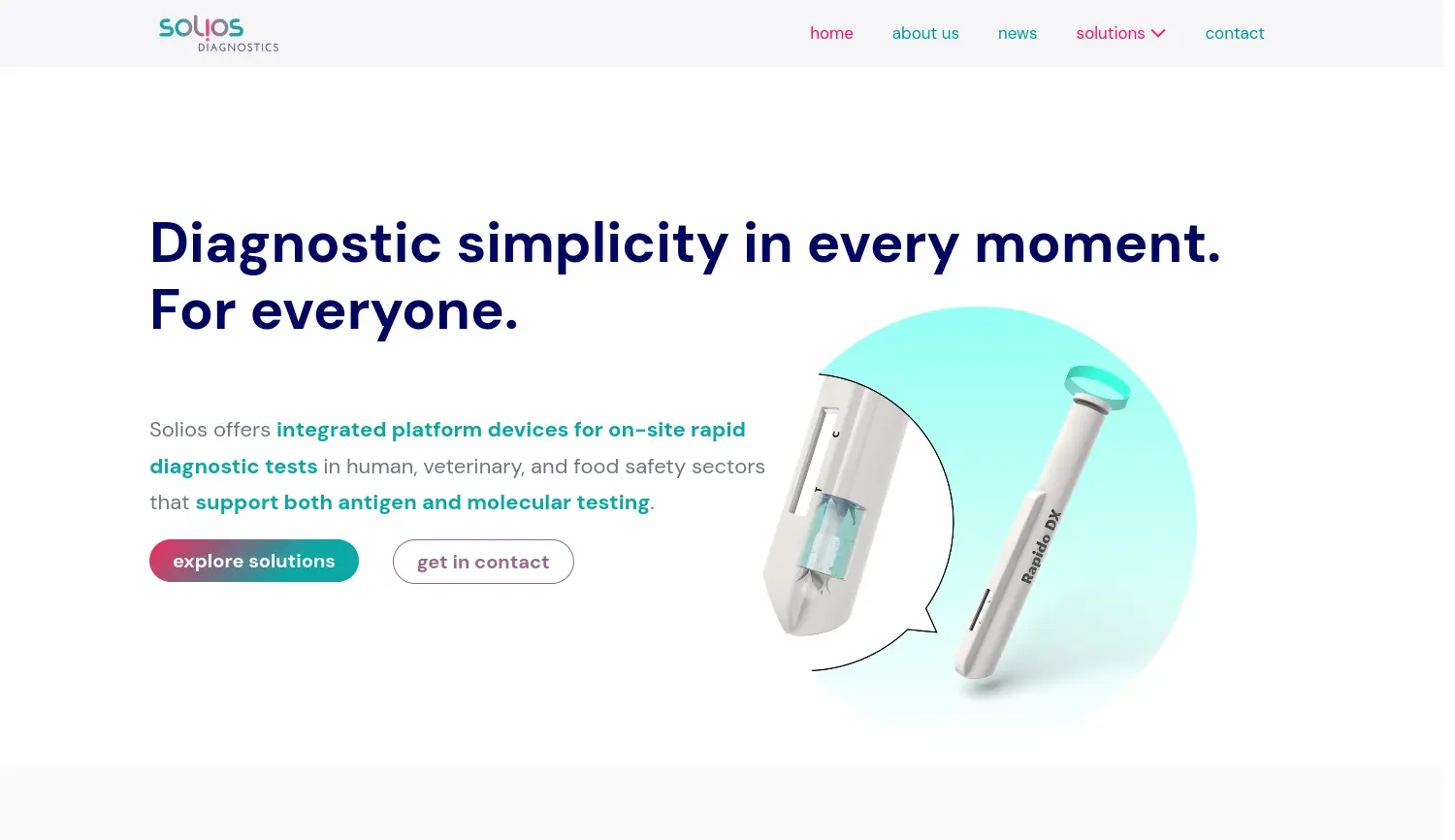 Diagnostische Einfachheit in jedem Moment. Solios Diagnostics bietet integrierte Plattformgeräte für schnelle Point-of-Care-Diagnosetests in den Bereichen Humanmedizin, Veterinärmedizin und Lebensmittelsicherheit.
