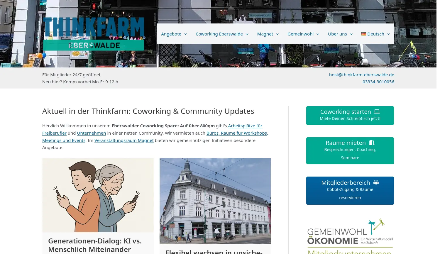 Coworking & Community in Eberswalde für Freiberufler und Unternehmen. Thinkfarm Eberswalde bietet flexible Coworking-Arbeitsplätze, Büros und Eventräume auf über 800qm mit Fokus auf Gemeinwohl und Community.