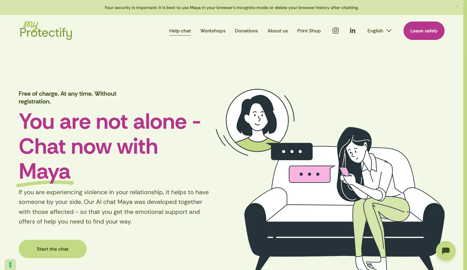 KI-gestützte Hilfe und Aufklärung gegen häusliche Gewalt – sicher und jederzeit. myProtectify bietet mit dem KI-Hilfe-Chat Maya rund um die Uhr anonyme und kostenlose Unterstützung für Betroffene häuslicher Gewalt.