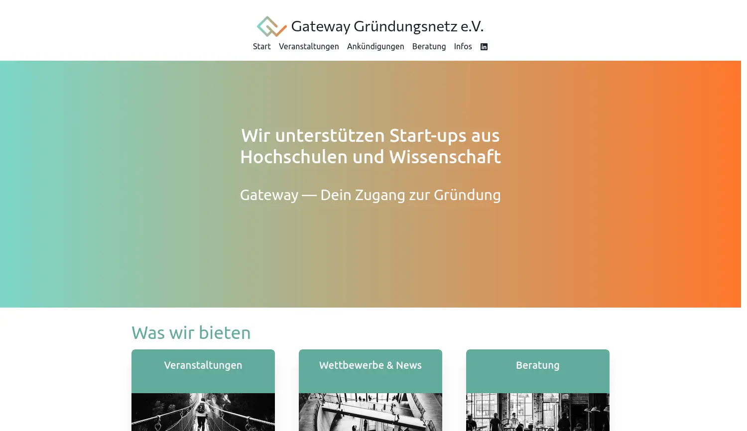 Wir unterstützen Start-ups aus Hochschulen und Wissenschaft. Das Gateway Gründungsnetz e.V. ist ein gemeinnütziger Verein zur Förderung von Start-ups aus Hochschulen und Wissenschaft in der Region Köln.
