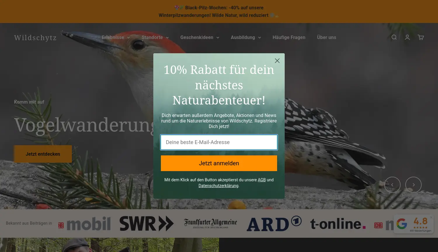 Pilzwanderungen und Walderlebnisse in deiner Region. Wildschytz bietet geführte Pilz-, Kräuter- und Vogelwanderungen sowie Walderlebnisse an zahlreichen Standorten in ganz Deutschland, ergänzt durch Ausrüstung und Ausbildungskurse.