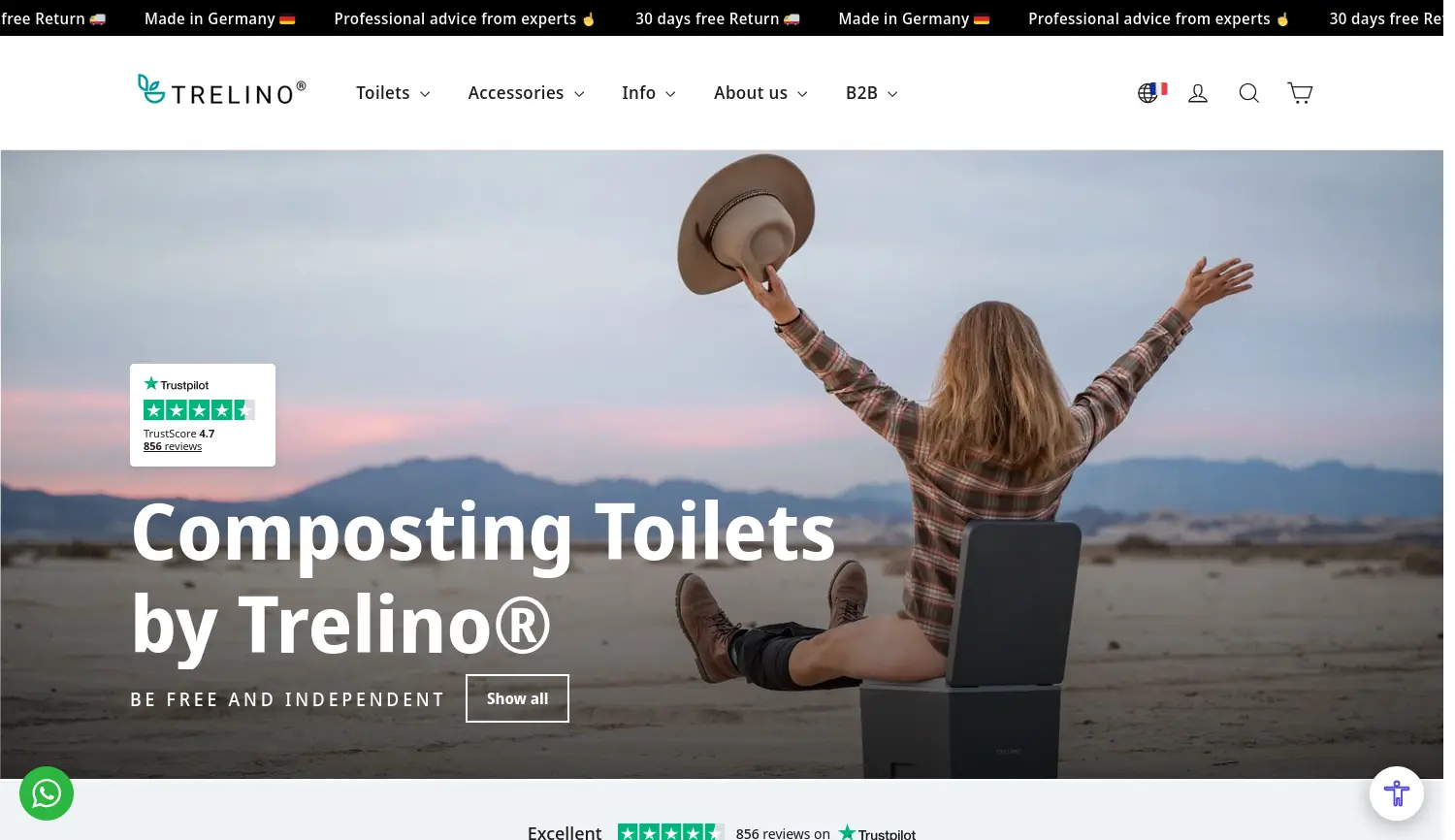 Mobile Trenntoiletten für grenzenlose Freiheit und Unabhängigkeit. Trelino® vertreibt kompakte, chemiefreie Trockentrenntoiletten und Zubehör für Camper, Vanlife und Tiny Houses als nachhaltige Sanitärlösung.