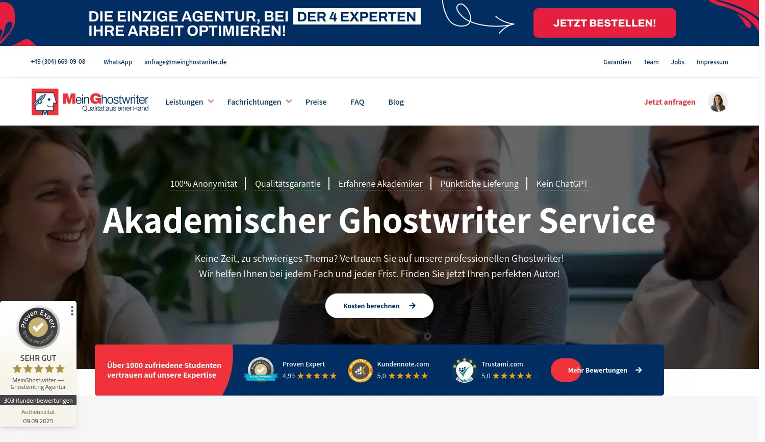 Ihr professioneller akademischer Ghostwriter Service für garantierte Qualität und Anonymität. MeinGhostwriter ist eine professionelle Agentur, die Studenten und Akademikern umfassende Ghostwriting-Dienste für wissenschaftliche Arbeiten in über 80 Fachrichtungen anbietet.
