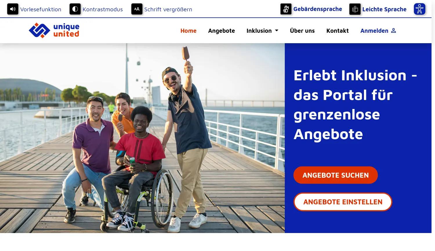 Erlebt Inklusion – das Portal für grenzenlose Angebote. Unique United ist eine inklusive Online-Plattform von und für Menschen mit Behinderungen, die barrierefreie Angebote in den Bereichen Jobs, Sport, Bildung, Entertainment und Reisen bündelt.