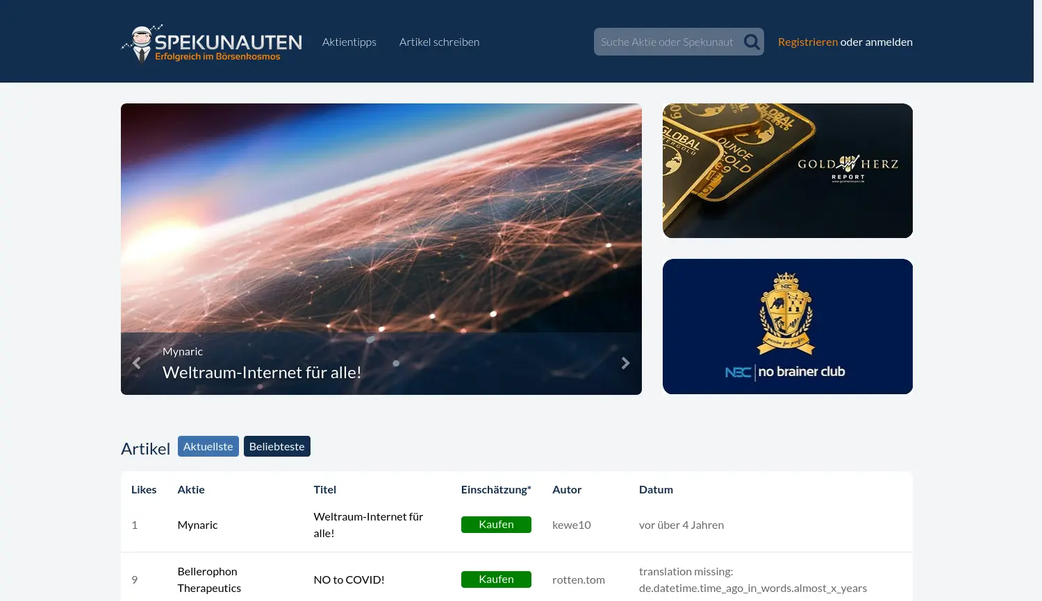 Die Community-Plattform für fundierte und spekulative Aktientipps. Spekunauten ist eine digitale Community-Plattform, auf der Nutzer Analysen und spekulative Einschätzungen zu verschiedenen Aktien für Privatanleger veröffentlichen.