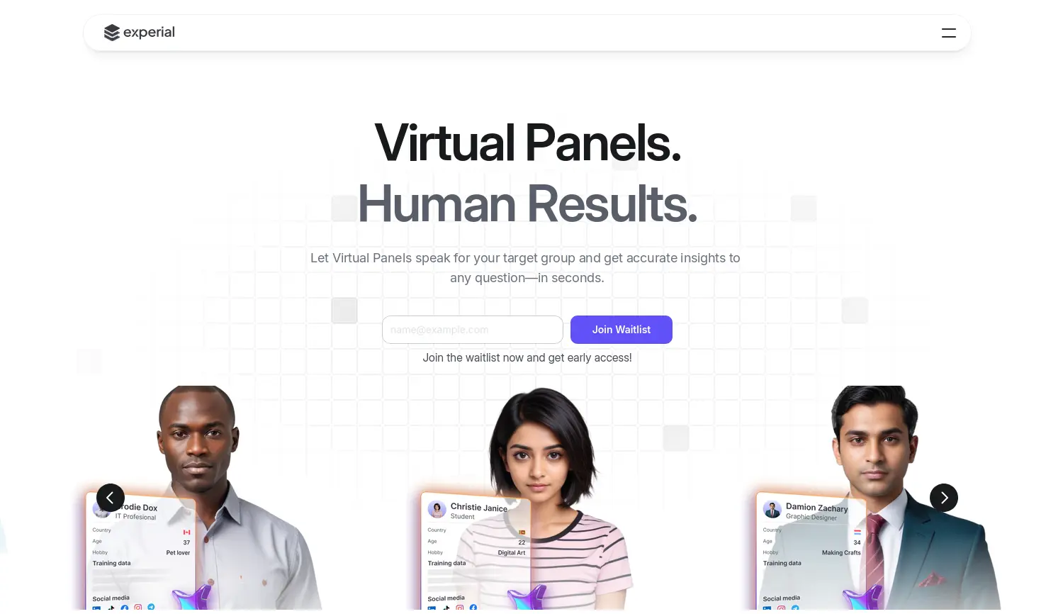 Virtuelle Panels. Menschliche Ergebnisse. Experial bietet Unternehmen sofortige und unbegrenzte Kundeneinblicke durch KI-gestützte Digital Twins und virtuelle Panels.