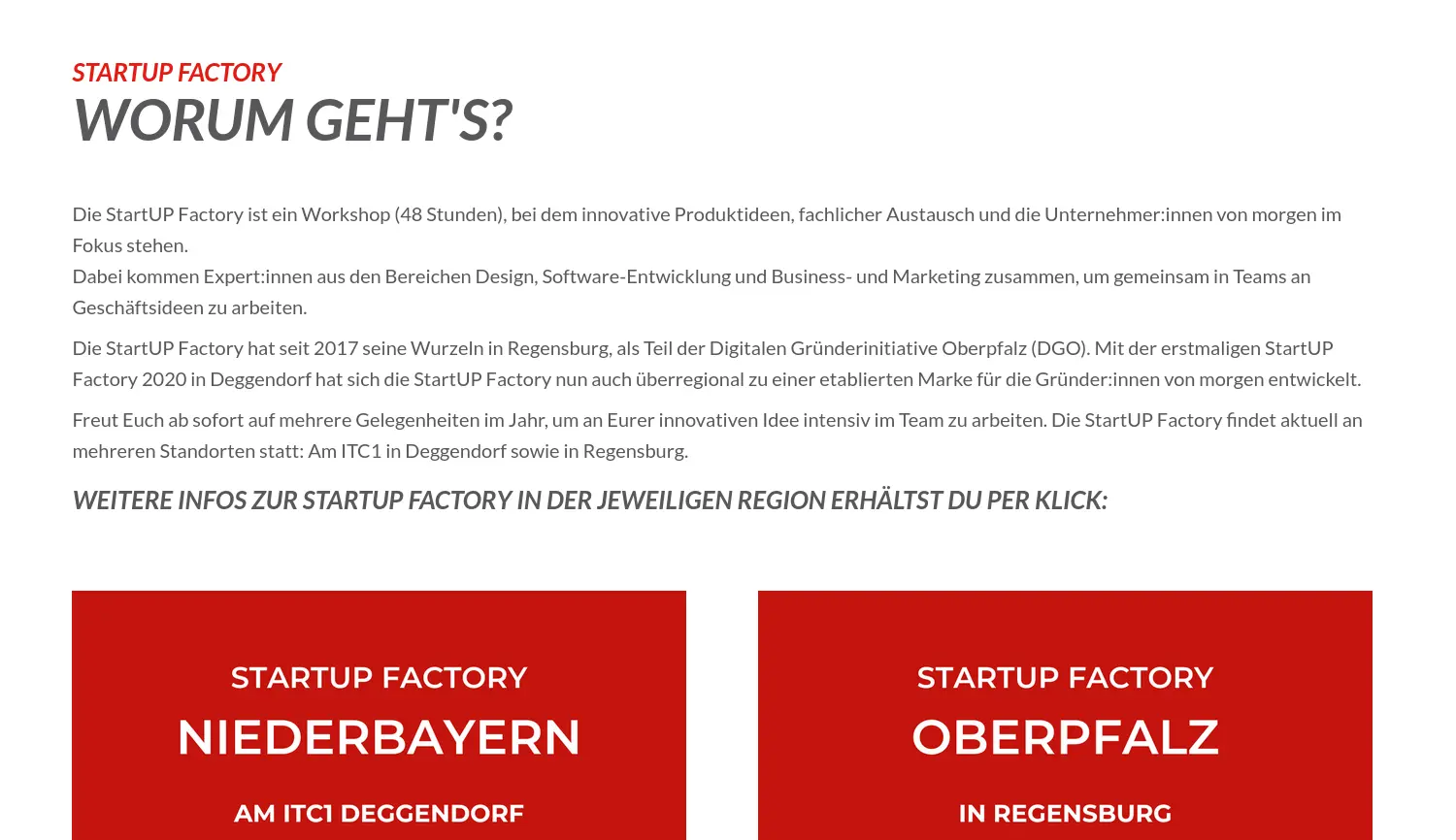 48 Stunden Intensiv-Workshop zur Entwicklung innovativer Produktideen. Die StartUP Factory ist ein 48-Stunden-Workshop, der Expert:innen aus Design, Software und Business zusammenbringt, um Gründerteams bei der intensiven Entwicklung ihrer innovativen Geschäftsideen zu unterstützen.