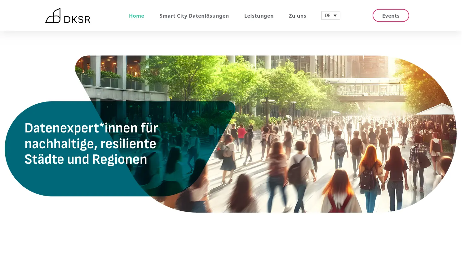 Datenexperten für nachhaltige, resiliente Städte und Regionen DKSR ist ein Kompetenzzentrum, das Städte und Regionen mit dem Smart City Data Hub CIVORA und umfassender Beratung dabei unterstützt, Daten für nachhaltige und resiliente Entscheidungen nutzbar zu machen.