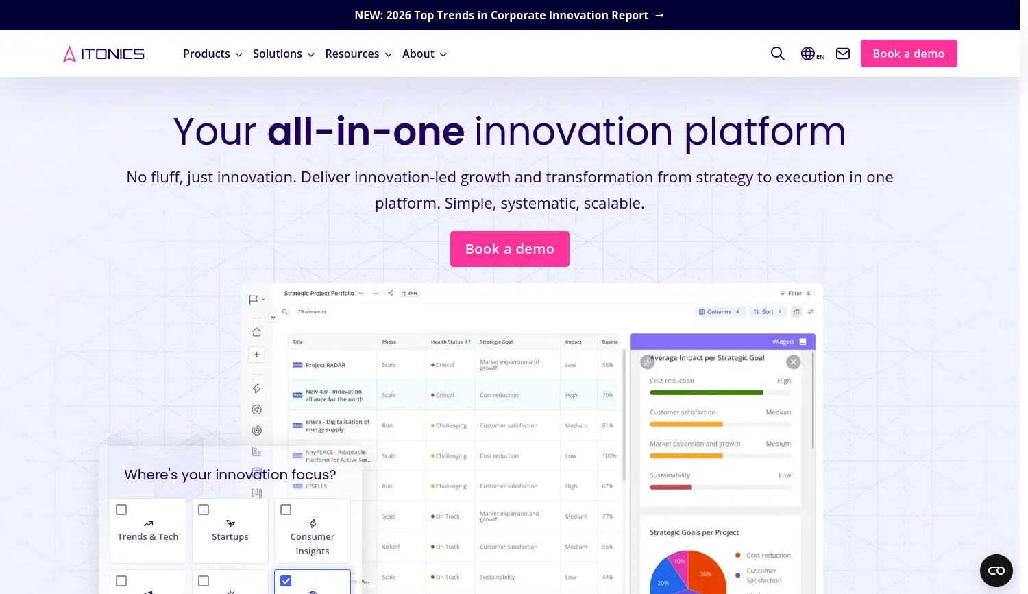 Das KI-gestützte Innovation Operating System für strategisches Wachstum. ITONICS bietet eine KI-gestützte SaaS-Plattform, die Unternehmen bei der strategischen Innovationsfindung, Ideenentwicklung und Portfolio-Optimierung unterstützt.