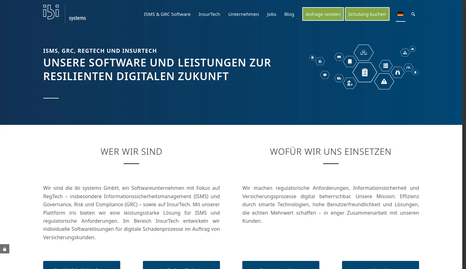 Software und Leistungen zur resilienten digitalen Zukunft für ISMS, GRC, RegTech und InsurTech. ibi systems ist ein deutscher Softwareanbieter, der modulare Plattformlösungen für Informationssicherheitsmanagement (ISMS), Governance, Risk & Compliance (GRC) sowie InsurTech entwickelt und betreibt.