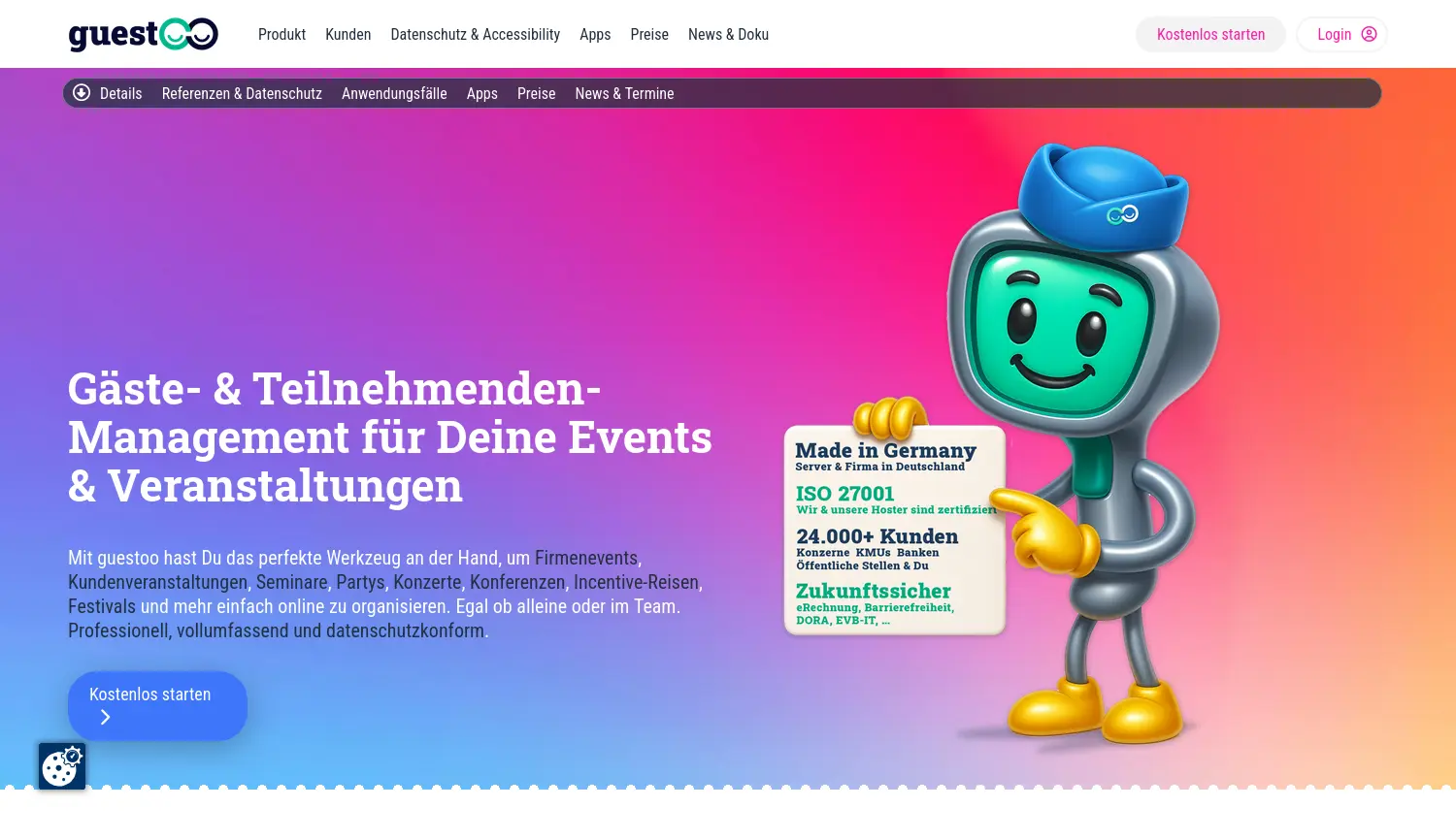 Gäste- und Teilnehmenden-Management für Deine Events und Veranstaltungen. guestoo ist eine umfassende Eventmanagement-Software zur digitalen Organisation von Gästen und Teilnehmern für alle Arten von Veranstaltungen.