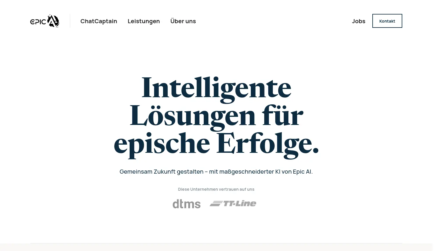 Intelligente Lösungen für epische Erfolge. Epic AI bietet mit der Plattform ChatCaptain und maßgeschneiderten Entwicklungsdienstleistungen intelligente Lösungen zur Automatisierung des Kundendialogs mittels Chat- und Voicebots.