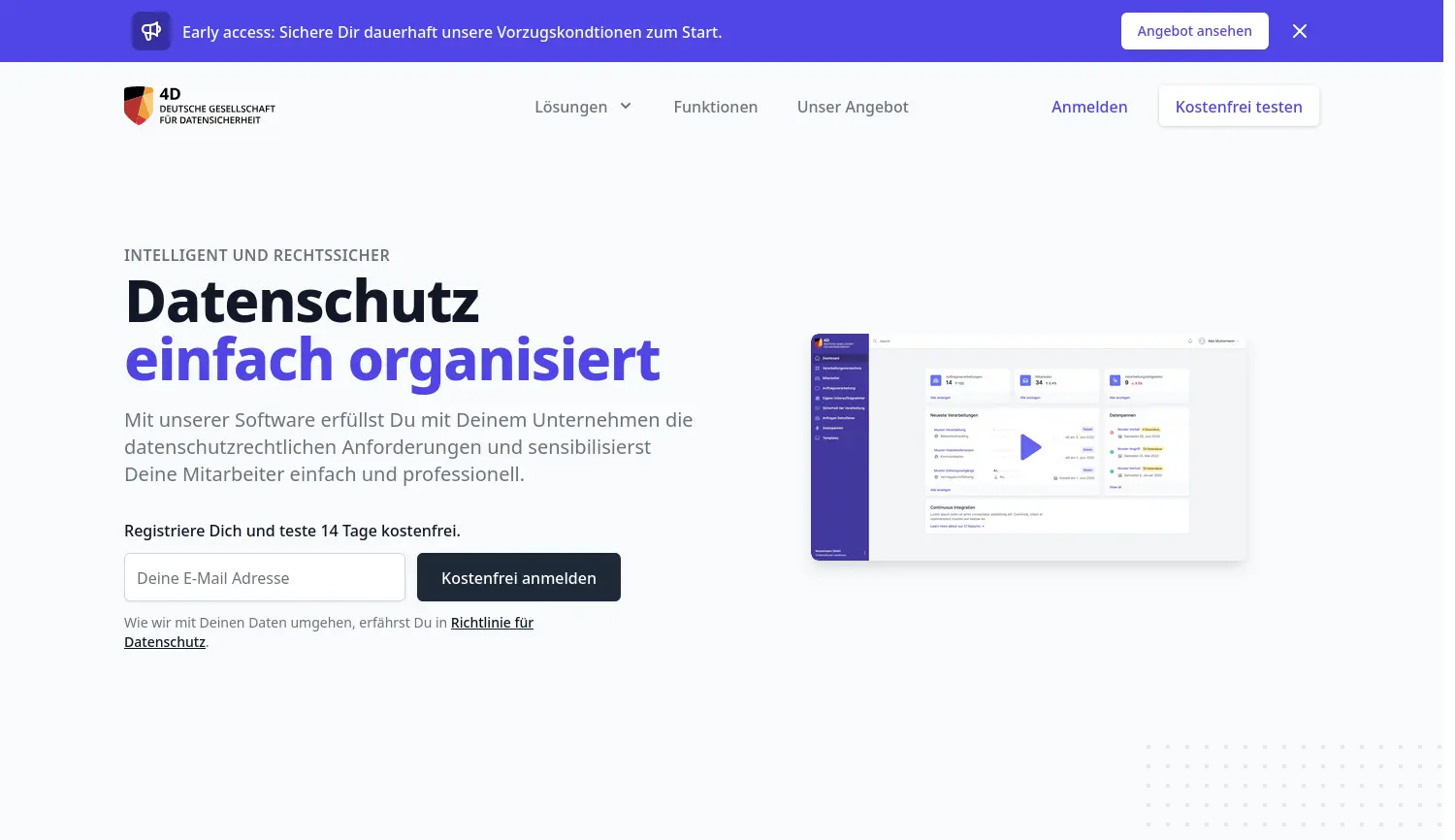 Intelligent und rechtssicher Datenschutz einfach organisiert Bietet eine intelligente SaaS-Lösung zur einfachen Organisation und Einhaltung aller datenschutzrechtlichen Anforderungen für Unternehmen.