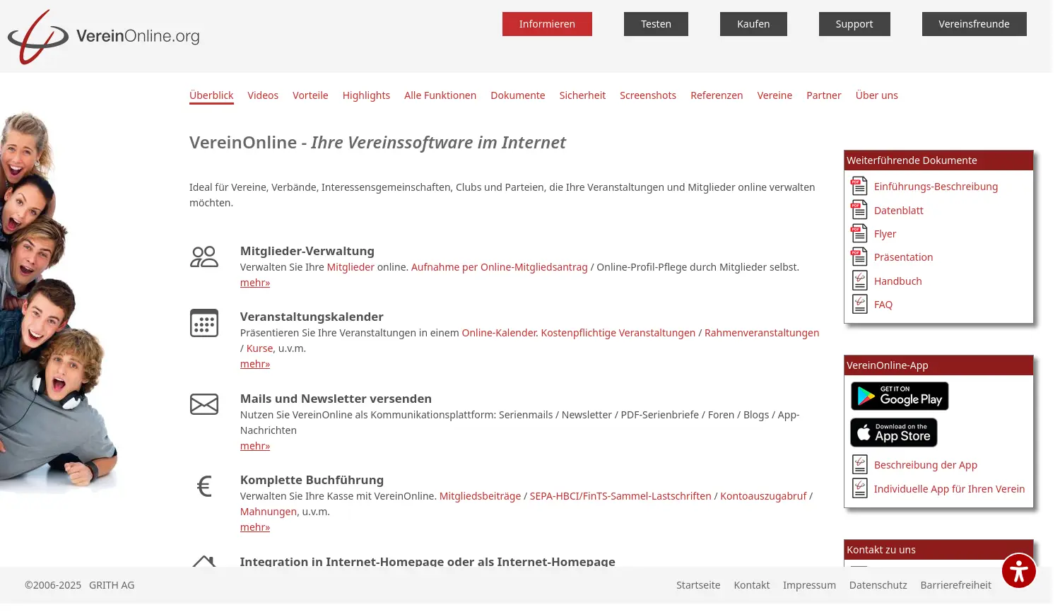 Ihre Vereinssoftware im Internet. VereinOnline ist eine umfassende Cloud-Software zur digitalen Mitglieder-, Veranstaltungs- und Finanzverwaltung für Vereine, Verbände und Interessensgemeinschaften.
