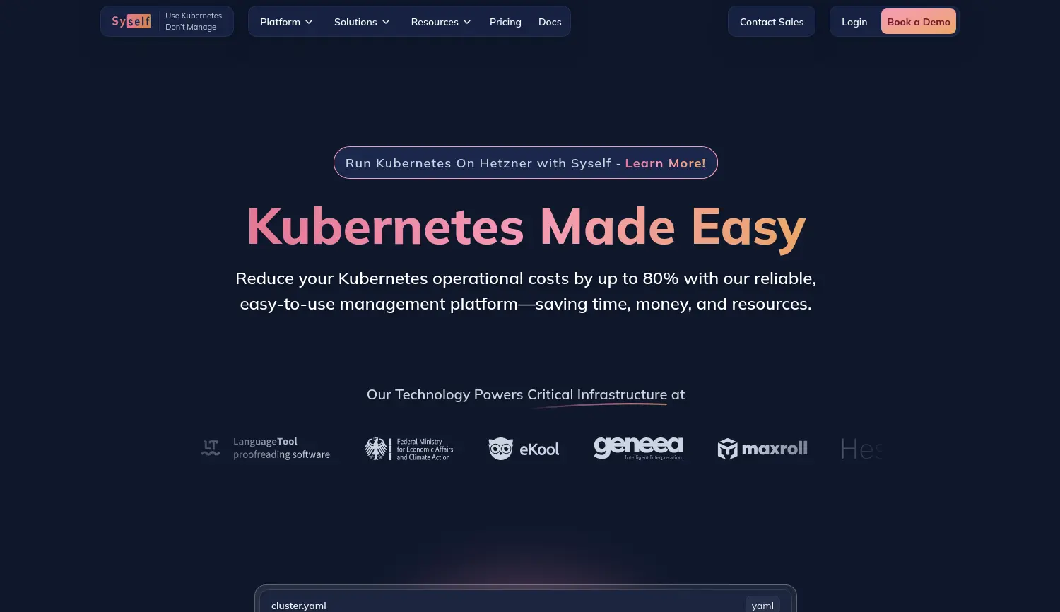 Kubernetes Made Easy – Vereinfachtes, sicheres Management für Ihre Cloud-Infrastruktur. Syself bietet eine vereinfachte und sichere Kubernetes Management Plattform, die speziell darauf ausgelegt ist, die Betriebskosten um bis zu 80% zu senken.