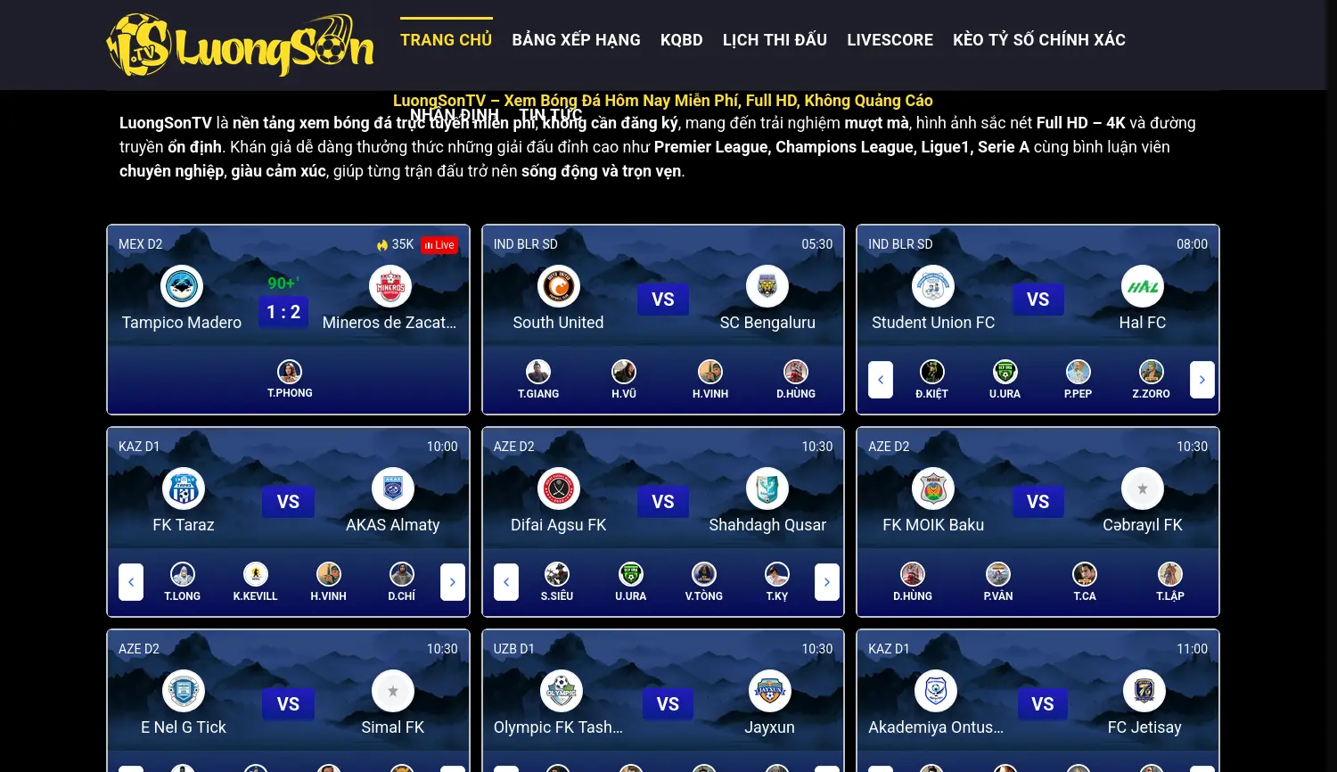 Kostenloses Live-Streaming von Fußballspielen in 4K-Qualität für vietnamesische Fans. LuongSonTV ist eine kostenlose Online-Plattform für vietnamesische Fußballfans, die Live-Übertragungen in Full HD und 4K, Spielstände und aktuelle Nachrichten bietet.