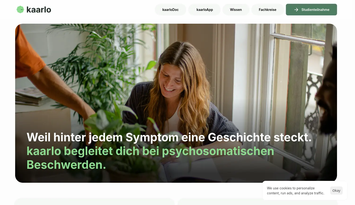 kaarlo begleitet dich bei psychosomatischen Beschwerden. kaarlo bietet digitale Therapie mittels der kaarloApp und psychologische Hilfe (kaarloDoc) für Menschen mit psychosomatischen und somatoformen Beschwerden.