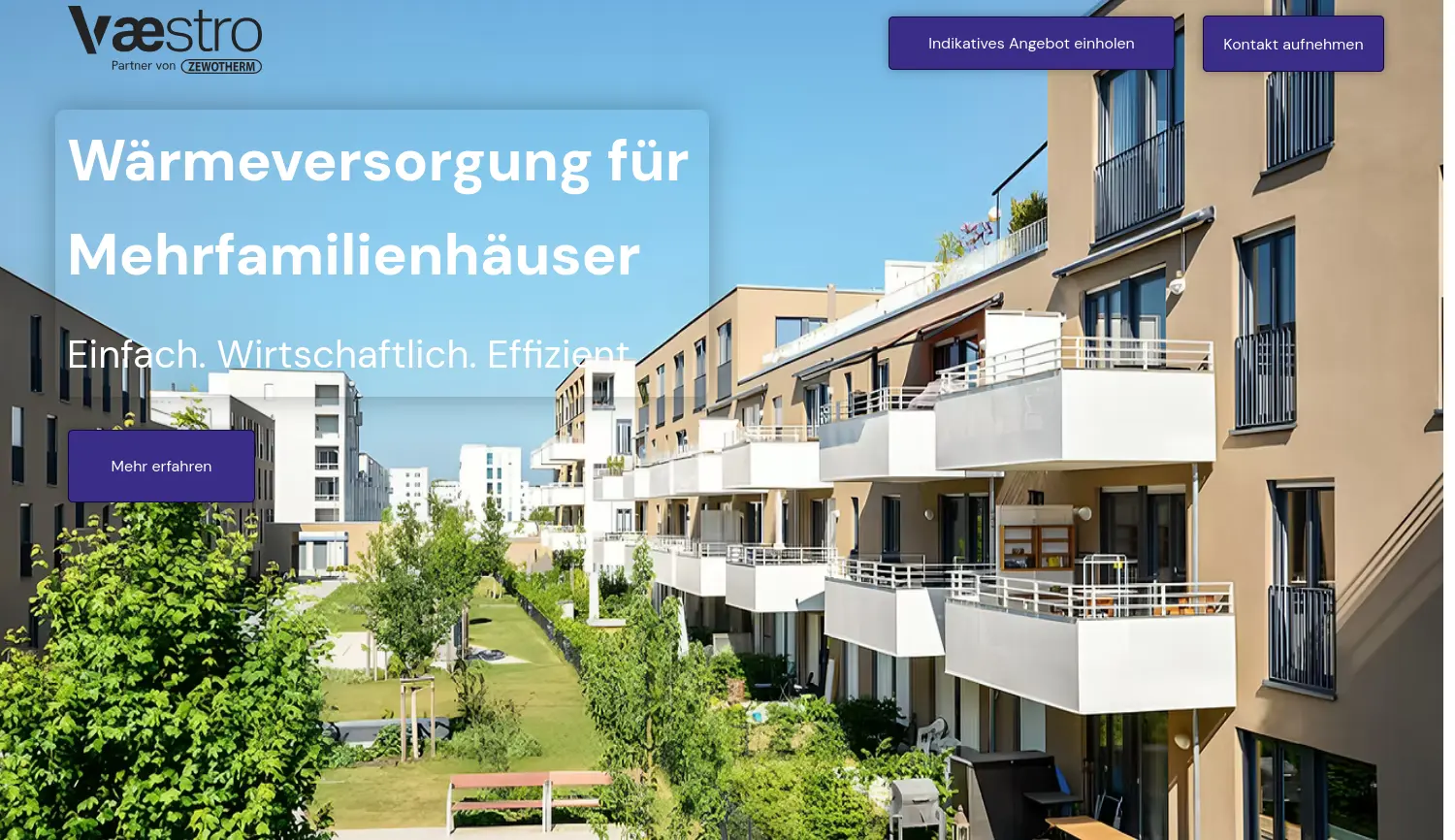 Einfache, wirtschaftliche und effiziente Wärmelösung für Mehrfamilienhäuser. vaestro bietet Vermietern von Mehrfamilienhäusern eine schlüsselfertige Wärmepumpenlösung inklusive Co-Investment, Installation und langfristigem Betrieb.