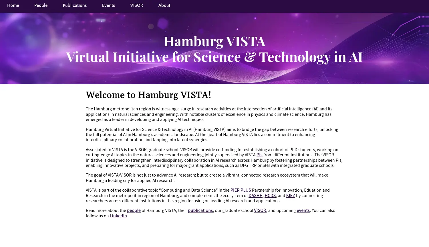 Brücke zwischen Forschung und Anwendung: Die Zukunft der KI in Hamburgs Naturwissenschaften und Technik. Hamburg VISTA ist eine virtuelle Initiative zur Stärkung der interdisziplinären Forschung und Anwendung von Künstlicher Intelligenz in den Naturwissenschaften und Ingenieurwesen in der Metropolregion Hamburg.