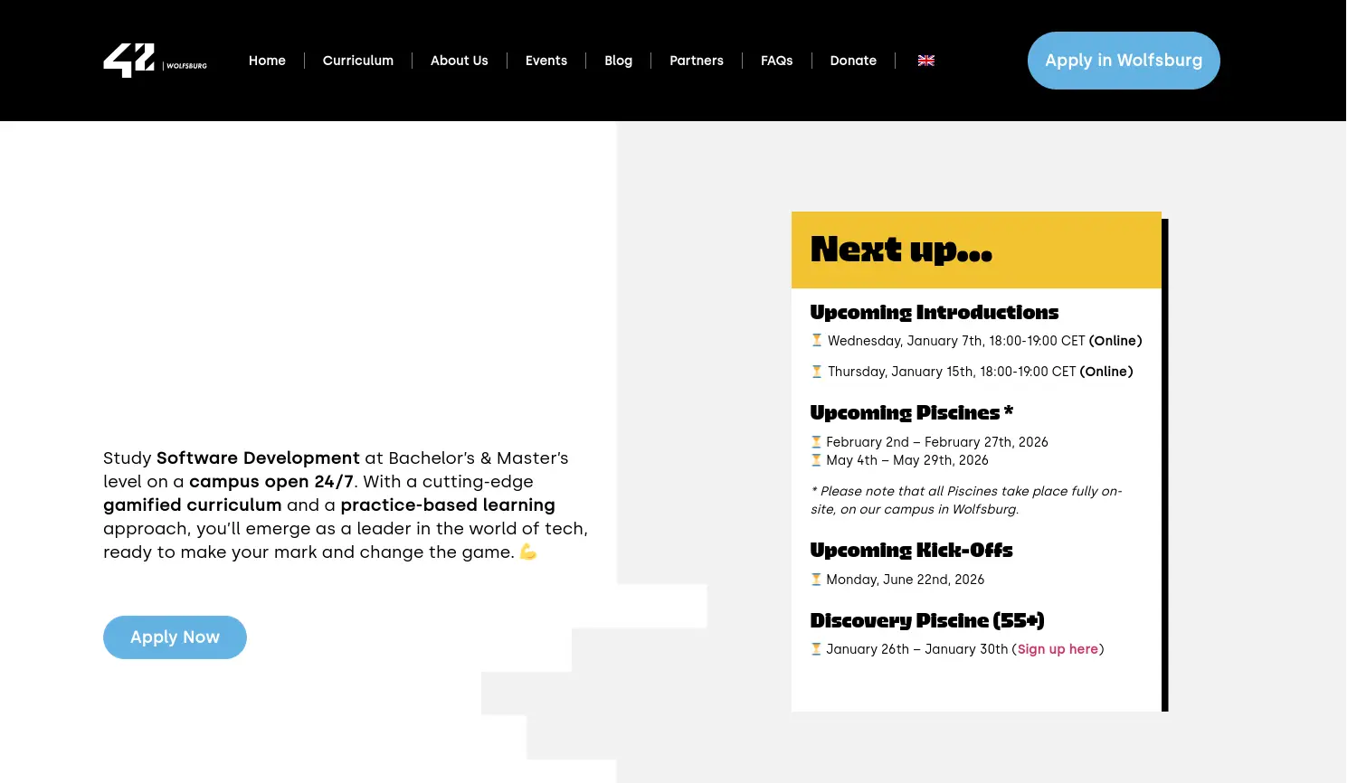 Lerne kostenlos programmieren in Wolfsburg und werde zum Tech-Innovator. 42 Wolfsburg ist eine gemeinnützige Programmierschule, die gebührenfrei Softwareentwicklung mittels Peer-to-Peer-Ansatz und projektbasiertem Lernen vermittelt.