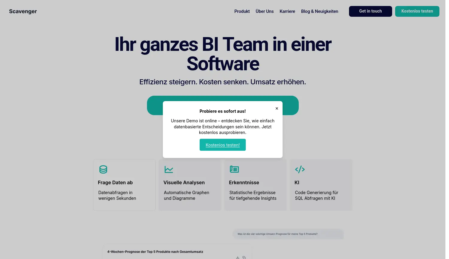 Ihr ganzes BI Team in einer Software. Scavenger AI bietet eine KI-gesteuerte Business Intelligence Software, die es Nutzern ermöglicht, Daten per natürlicher Sprache abzufragen und tiefgehende Insights zu generieren.