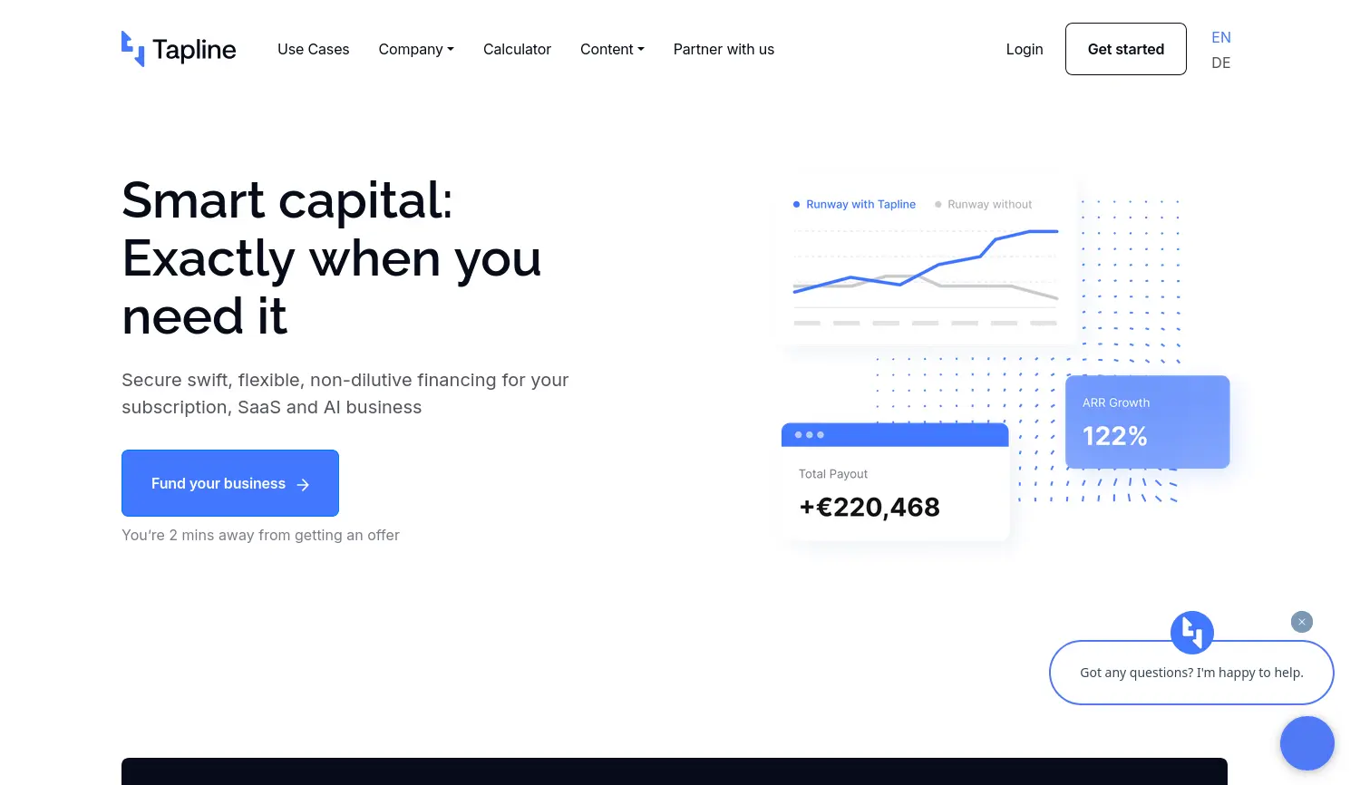 Smartes Kapital: Flexible und nicht-verwässernde Finanzierung für Ihr Abonnementgeschäft. Tapline ist eine digitale Finanzierungsplattform, die SaaS- und Abo-Unternehmen nicht-verwässerndes Kapital gegen Zeichnungsforderungen bereitstellt.